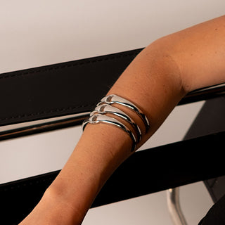 Minimal close-up of the Pebble Cuff Bangle in silver highlighting its smooth pebble-shaped ends.