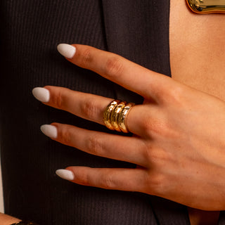Model wearing the Manhattan Liquid Ring alongside other mixed-metal rings and City Collection earrings, highlighting the ring’s sculptural liquid-metal finish.