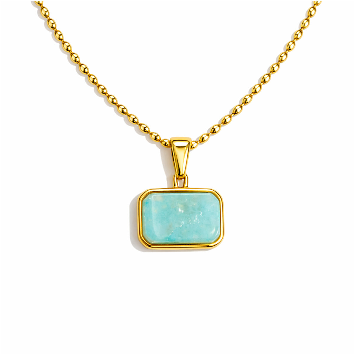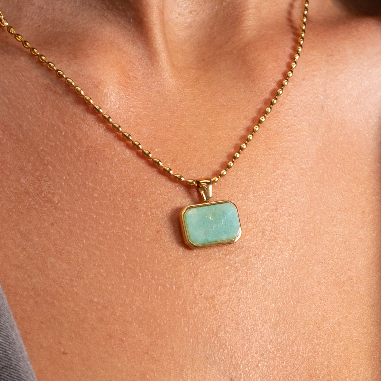 Inspired by modern European sophistication, the Serena Amazonite Necklace introduces a refined touch of soft green to your jewellery collection. The polished gold setting frames natural amazonite with clarity and poise, offering calm confidence and subtle, contemporary luxury.