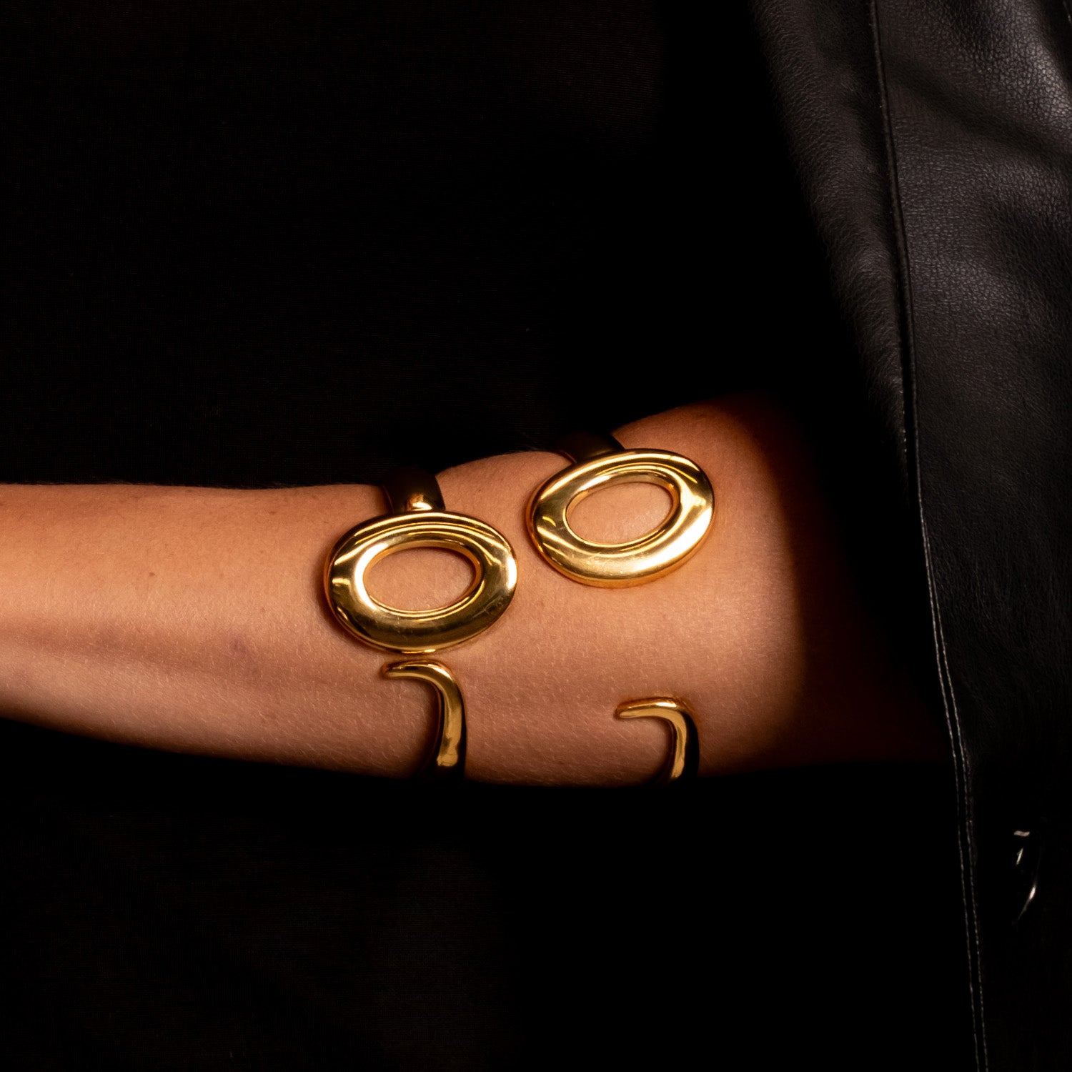 Inspired by molten gold and sharp modern design, the Spencer Lock Bangle brings polished confidence to any look. Its asymmetrical silhouette and signature O-shaped clasp create a refined statement that feels bold without trying. This is the piece you reach for when you want impact delivered with ease.