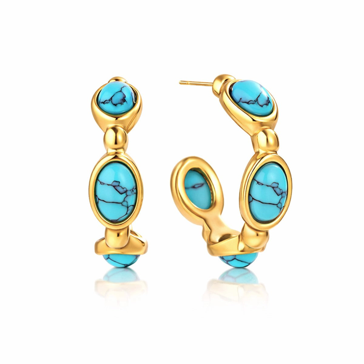Inspired by sunlit coastlines and crystal-blue waters, the Aegean Turquoise Earrings bring a fresh pop of colour and effortless elegance. Turquoise-style stones rest in polished gold, adding a radiant touch that lifts any look with refined coastal glamour.